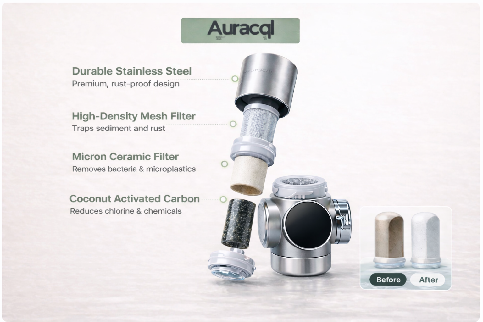 Auracql hilft, Schwermetalle, Chlor, Mikroplastik, Rost, Sedimente und andere häufige Verunreinigungen im Leitungswasser zu reduzieren – und gleichzeitig essentielle Mineralien zu erhalten, die Ihr Körper benötigt.